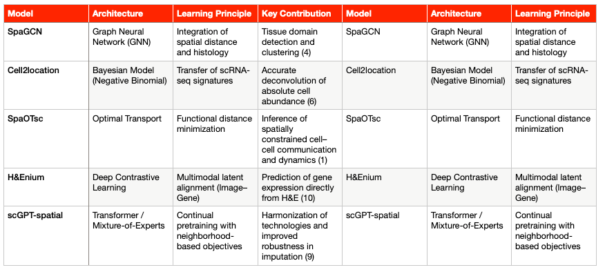 scGPT-spatial: Based on a Transformer architecture, this model employs continual pretraining on large spatial datasets. To accommodate diverse sequencing protocols (sST, iST), it uses a Mixture-of-Experts (MoE) structure in its decoders (9). The goal is to harmonize technologies, improve robustness in gene-expression imputation, and enhance performance in clustering and deconvolution tasks (9).